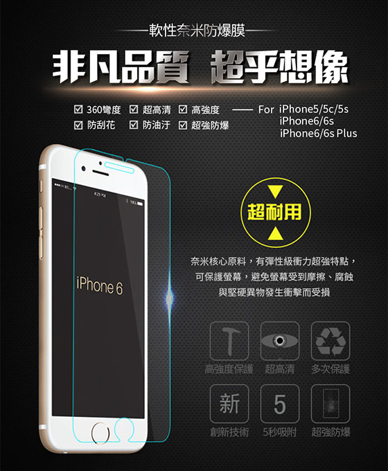 堅韌強,不變形! ![]() ![]() 商品規格 品名:終結手機碎屏完美保護貼防護組 型號: iPhone5 / 5s iPhone6 / 6s iPhone6 Plus / 6s Plus 防爆膜厚度:0.2mm 成分/材質:奈米PET防爆膜TPU材質防摔殼 內容物/配件(品項/數量):保護貼X1 / 手機殼X1 / 清潔組X1 產地:中國 |