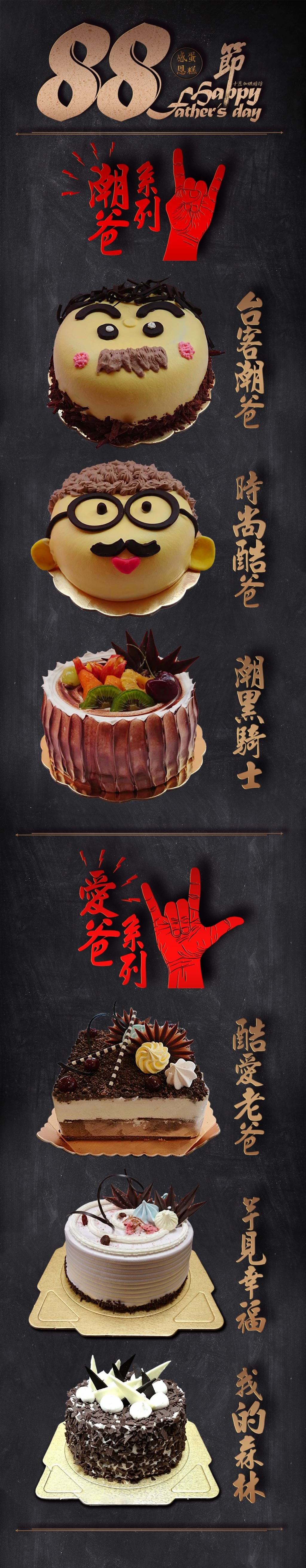 ☆潮爸系列蛋糕有: 台客潮爸 內餡為新鮮好吃的水果+布丁 時尚酷爸 內餡為新鮮好吃的水果+布丁 潮黑騎士 蛋糕體為巧克力 內餡為藍莓布丁 ☆愛爸系列蛋糕有: 酷愛老爸 為新鮮香蕉加上巧克力,香濃絕配滋味,少甜不膩口!絕對是爸爸的最愛!