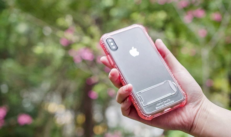 站立式抗摔空壓保護背蓋,品牌形象融入外觀設計與保護力結合獨特TPU軟料材質作為外框與四角減震設計,